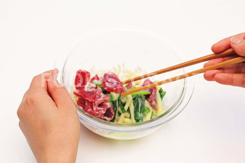 食べる直前に④に①、③を加えてあえ、器に盛る。 |