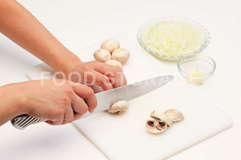 玉ねぎ、にんにくはみじん切り。マッシュルームは3等分の厚さに切る。 |
