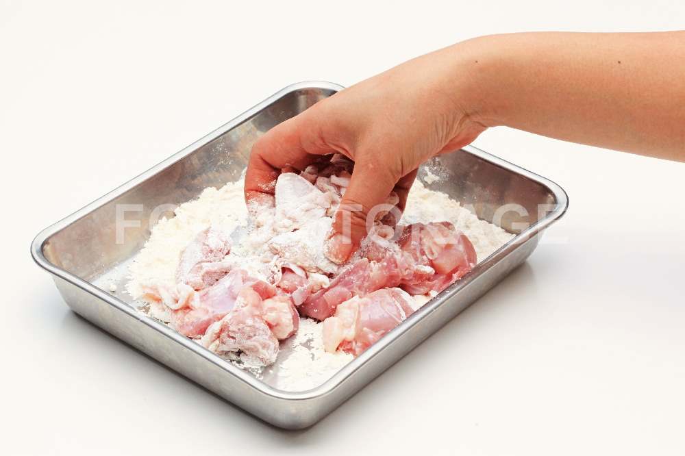 鶏もも肉は一口大に切って、塩、こしょうをふり、小麦粉をまぶす。 |