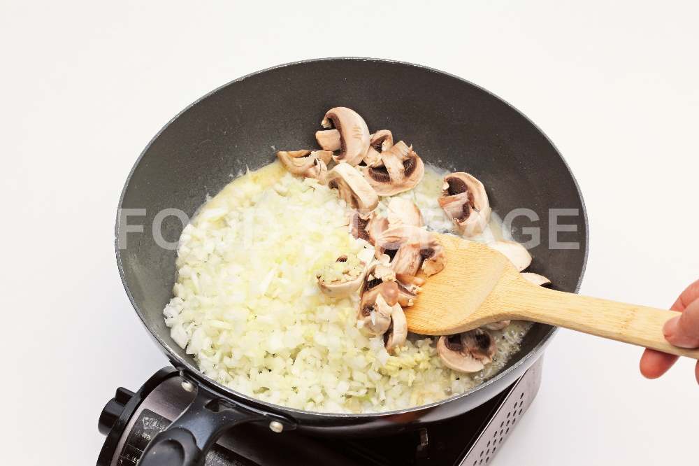 バターを加えて溶かし、1の玉ねぎ、にんにく、マッシュルームを加えて、玉ねぎが透き通るまで炒める。 |