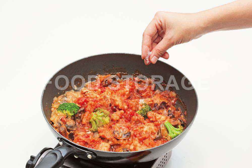 5の鶏肉を戻し入れてホールトマト、Aを加え、軽くトマトをつぶしてふたをし、弱火で10分煮込む。ブロッコリーを加えて5分煮込む |