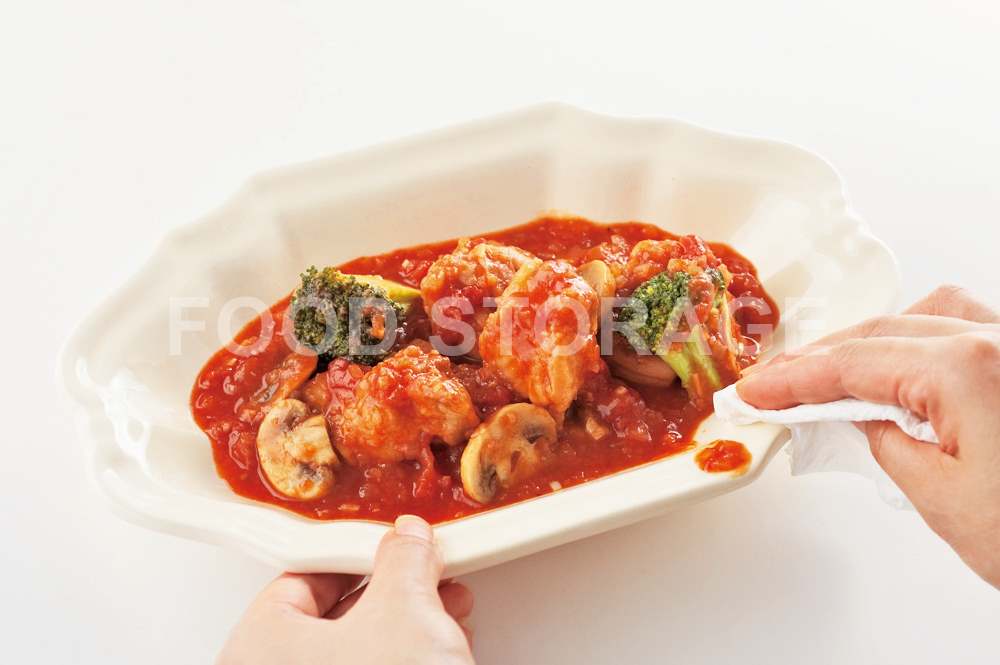 器に盛りつけた時の汚れを残さない。器のふちに飛んだソースは、ペーパータオルなどで拭き取るようにしてきれいに。 |