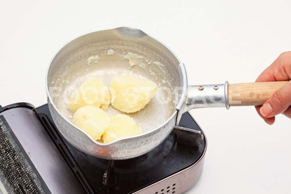 じゃがいもは皮をむいて4等分に切って鍋に入れ、かぶるくらいの水を入れて火にかけ、沸騰したら中火でやわらかくなるまで茹でて湯を捨てる。 |