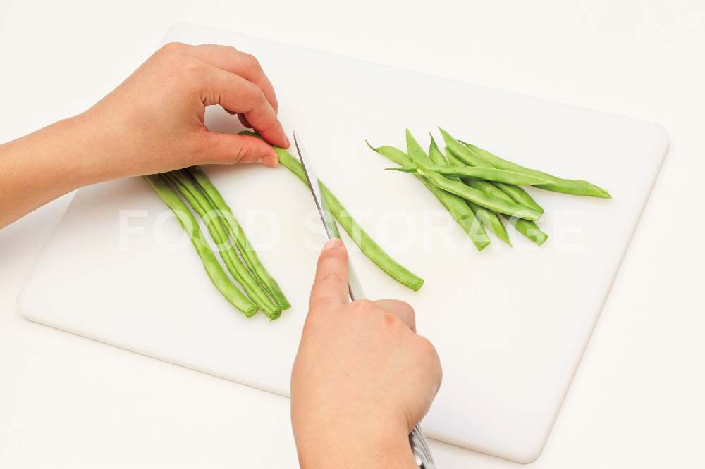さやいんげんはへたとすじを取り、斜め半分に切る。 |