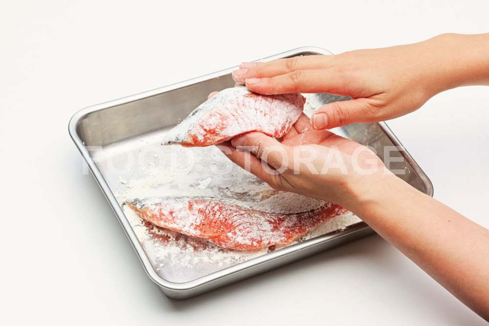 POINT:小麦粉が付いていると、こんがりときれいに焼ける。 |