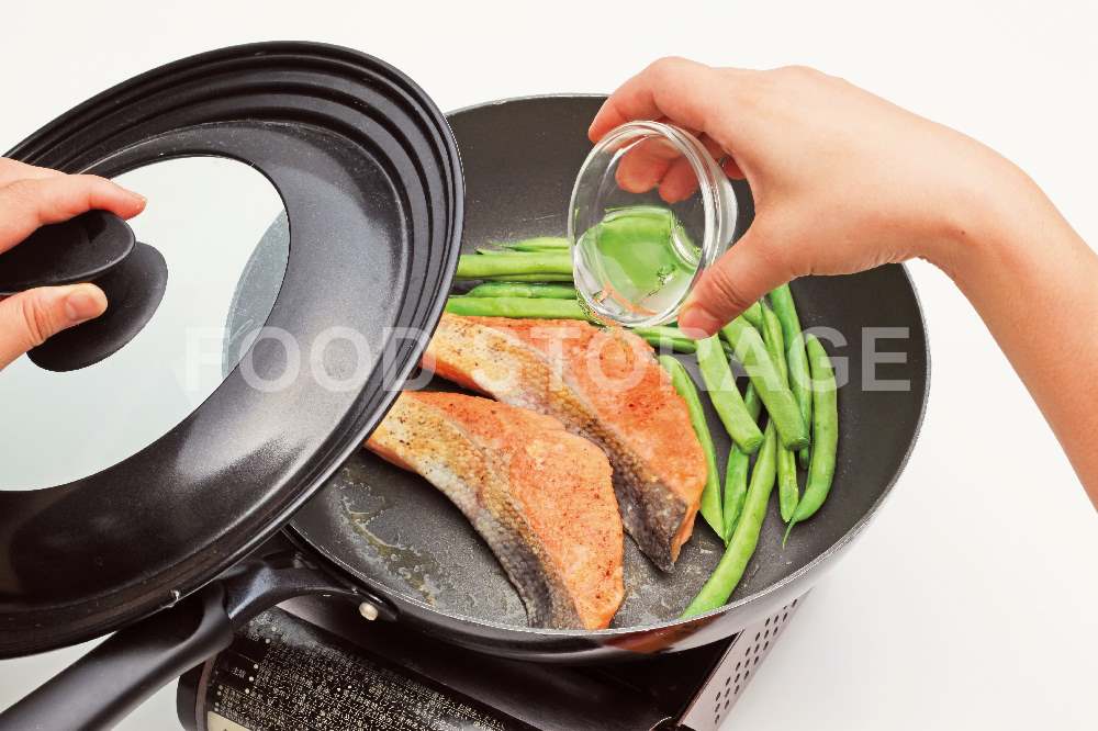 鮭を裏返して中火で焼き、白ワインを加えて蓋をして弱火で蒸し焼きにする。2とともに器に盛る。 |