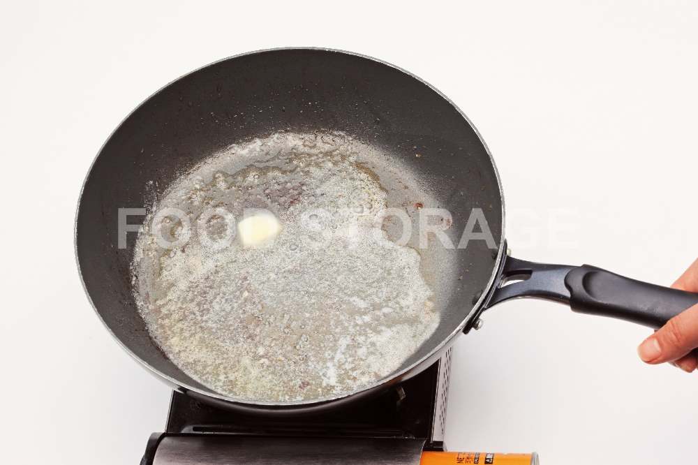7のフライパンを再び中火にかけ、バターを加え、焦がさないようフライパンを回しながら溶かす。 |