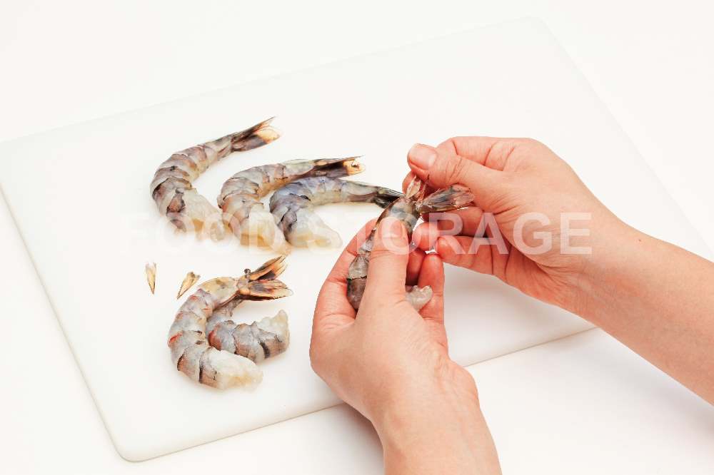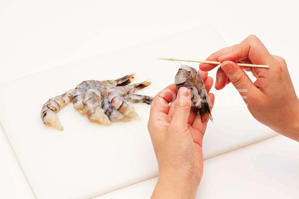 えびは尾を残して殻をむき、関節の間に竹串を刺して背わたを取り除く。 |