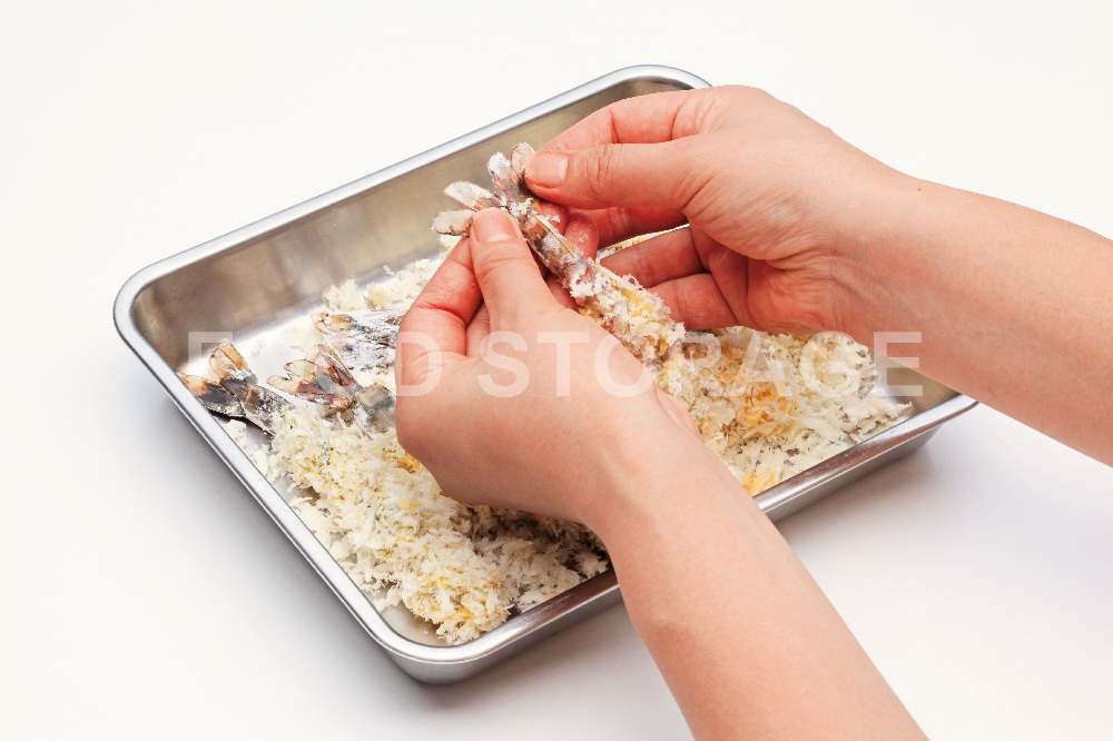 混ぜ合わせたAに6をくぐらせ、生パン粉をまぶし、手で軽く握りながらしっかりとまぶしつける。形よく仕上がるように尾の先を広げておく。 |
