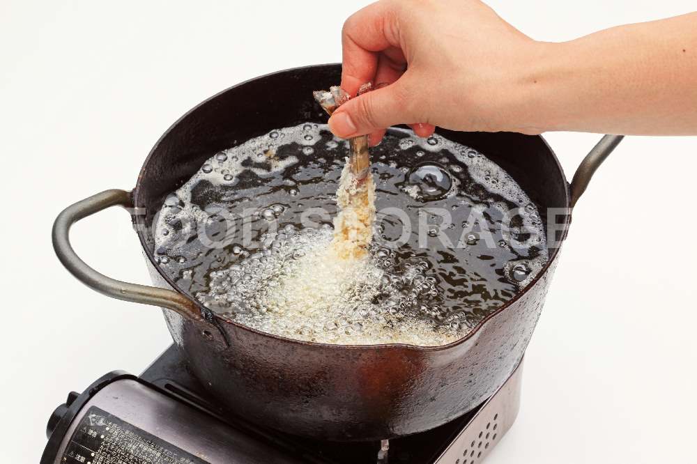 揚げ油を180℃に熱し、7の尾を持って、向こう側に泳がすようにして入れる。 |