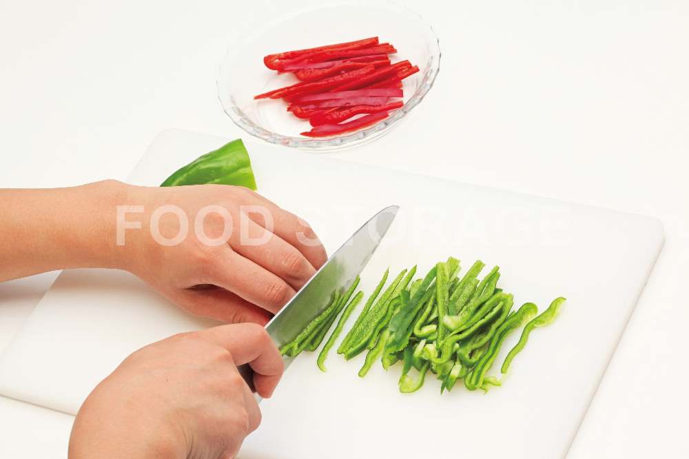 ピーマン、赤ピーマンはヘタと種を取り除いて5㎜幅の細切りにする。