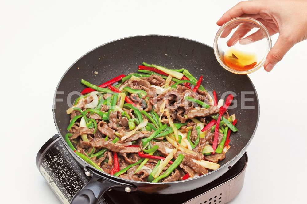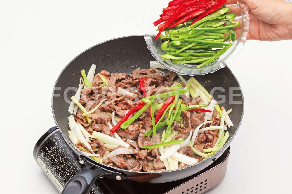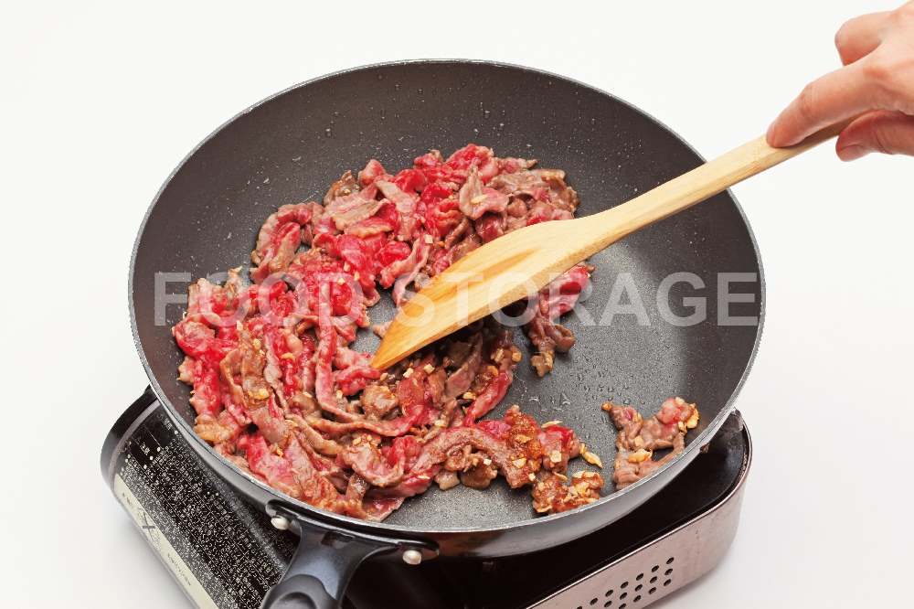 強火にして3の牛肉を加えて肉の色が変わってくるまで炒める。 |