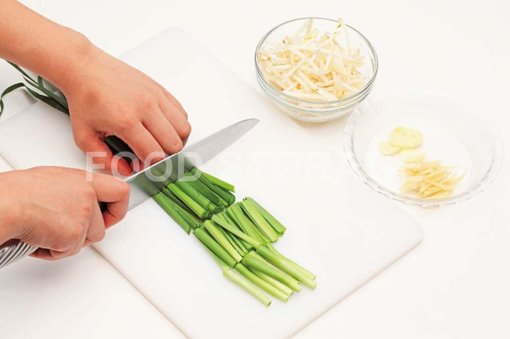 しょうがは皮を向いて千切りに、にんにくは薄切りにする。にらは5㎝幅に切る。もやしは洗ってひげ根を取り水気を切る。 |