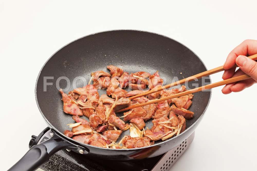 5のフライパンに残りのサラダ油を出し、3のしょうが、にんにくを入れて強火にかけ、香りが立ってきたら、レバーを加えて焼き色がつくまで1分ほど炒める。 |