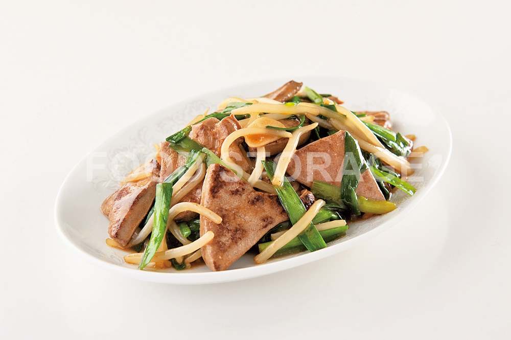 レバーは軽く水洗いして、水に浸して20分おき、7㎜厚さの斜め切りにしてよく水気を拭き取る。 |