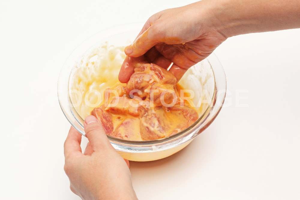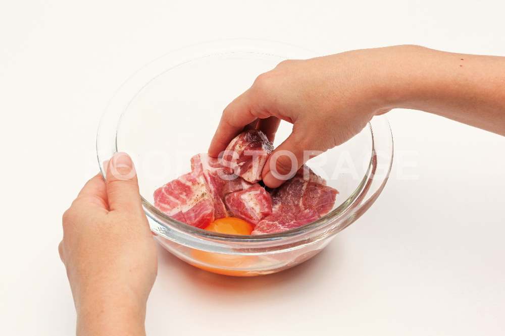 豚肉は一口大に切る。ボウルに入れ、塩、こしょうをふり、卵を割り入れてもみ込む。 |