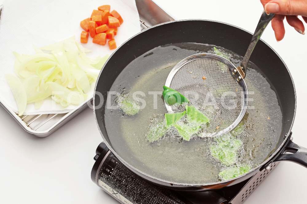 揚げ油を160℃に熱し、にんじん、玉ねぎ、ピーマンの順に素揚げをし、油を切る。 |