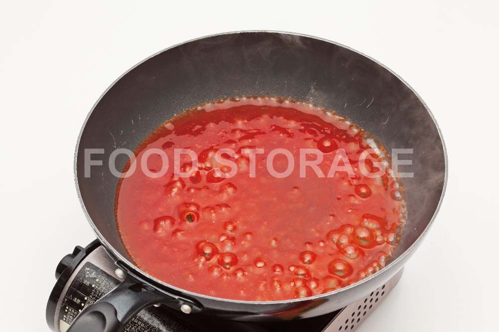 別のフライパンに4を入れて中火にかけかき混ぜながらとろみがつくまでに立てる。 |