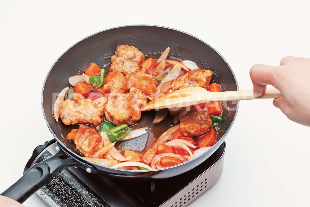 POINT:揚げたら野菜と豚肉をタレに加えて、手早く絡ませ食感を良くする。 |