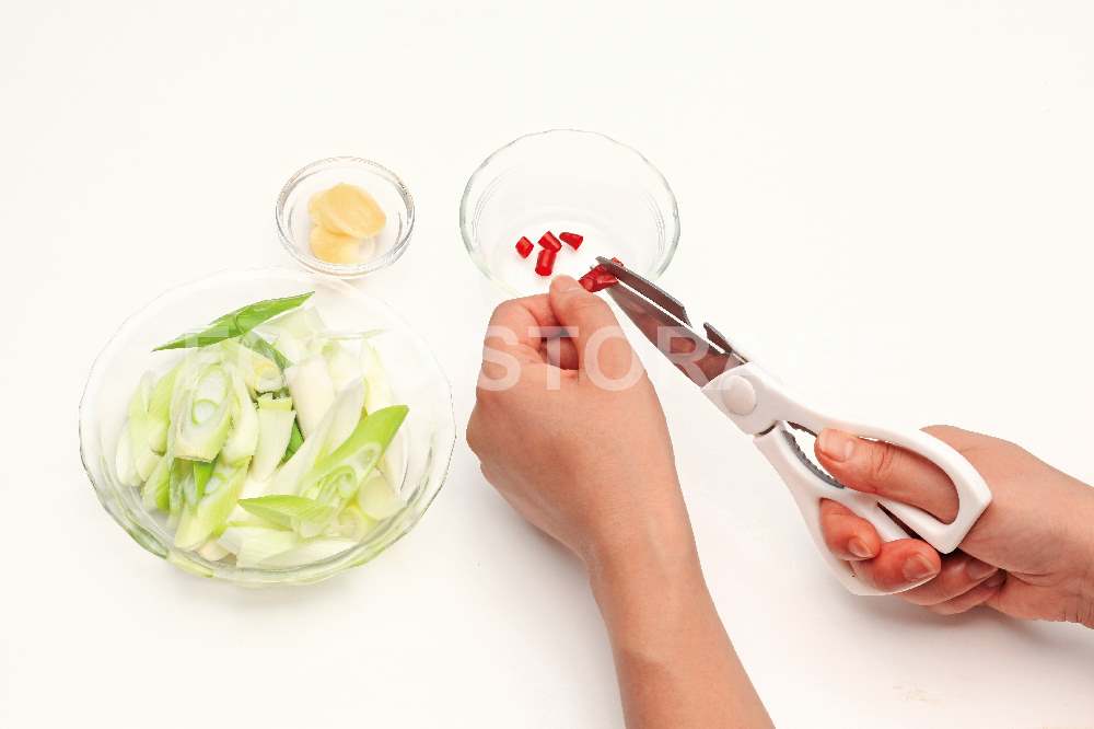赤唐辛子はヘタを取って種を取り除き、ハサミで約1㎝幅に切る。長ねぎは1㎝幅の斜め切り、しょうがは皮をむき薄切りにする。 |