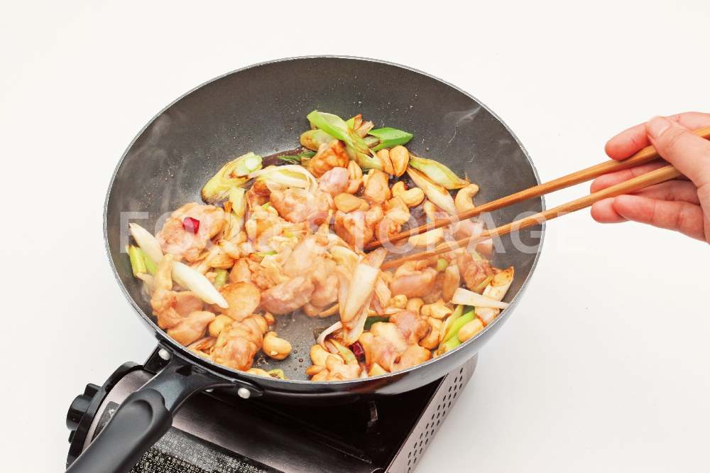 肉の色が変わったら4とカシューナッツを加えて炒め、合わせ器に盛る。