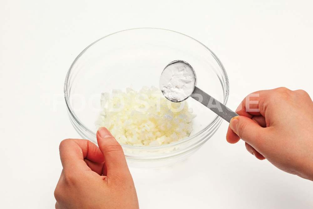 玉ねぎはみじん切りにしてボウルに入れ、片栗粉を加えて混ぜ合わせておく。