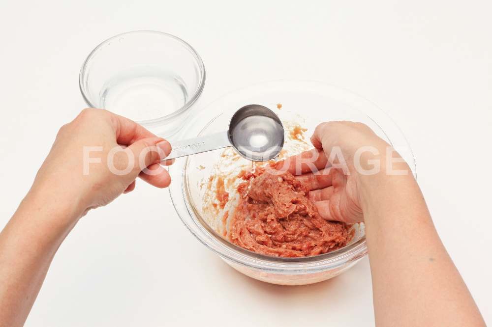 別のボウルに豚ひき肉を入れ、塩を加えて白っぽくなるまで練る。少しずつ水を加えて混ぜる。 |
