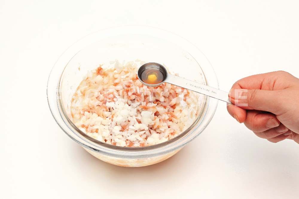 POINT:片栗粉をまぶすと玉ねぎがひき肉になじみやすい。 |