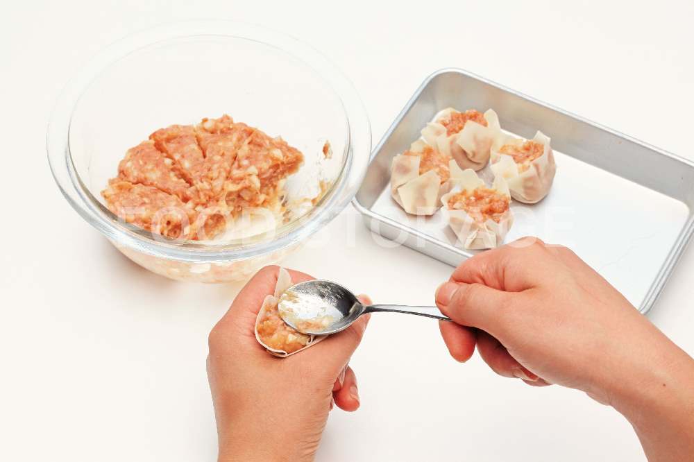 3を10等分にしてシュウマイの皮で包む。 |