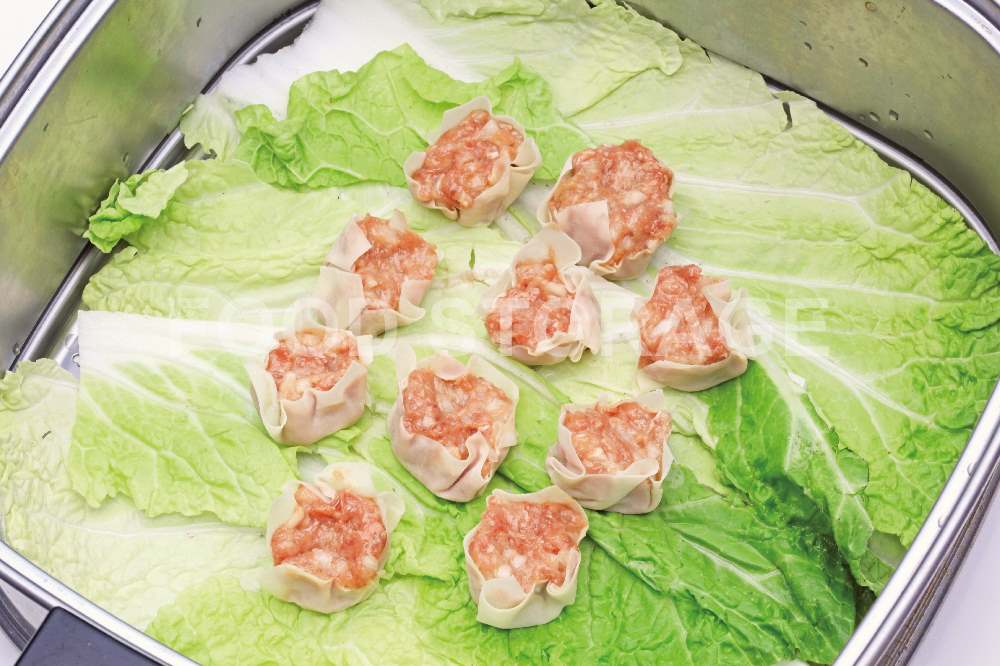 POINT:蒸し器にくっつかないように下に白菜の葉を敷く。 |