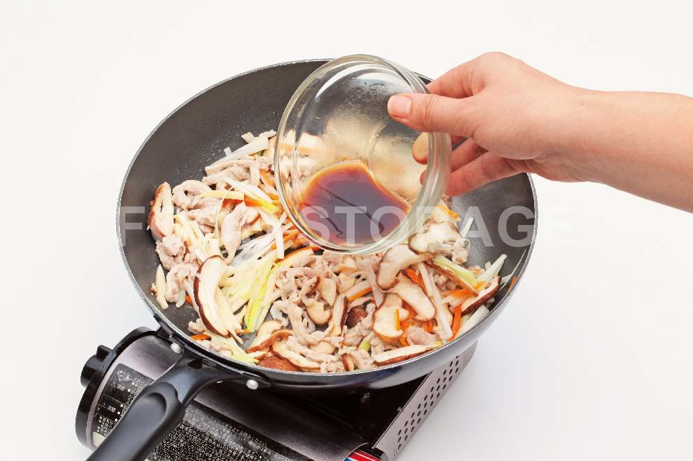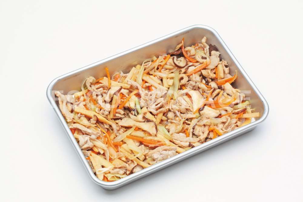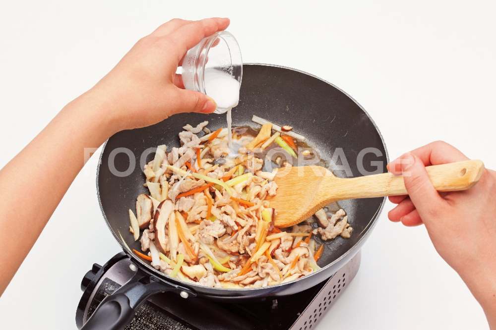 豚肉薄切り肉は細切りにして、塩、こしょうをふる。たけのこ、にんじん、長ねぎは細切りしいたけは軸を落として薄切りにする。 |