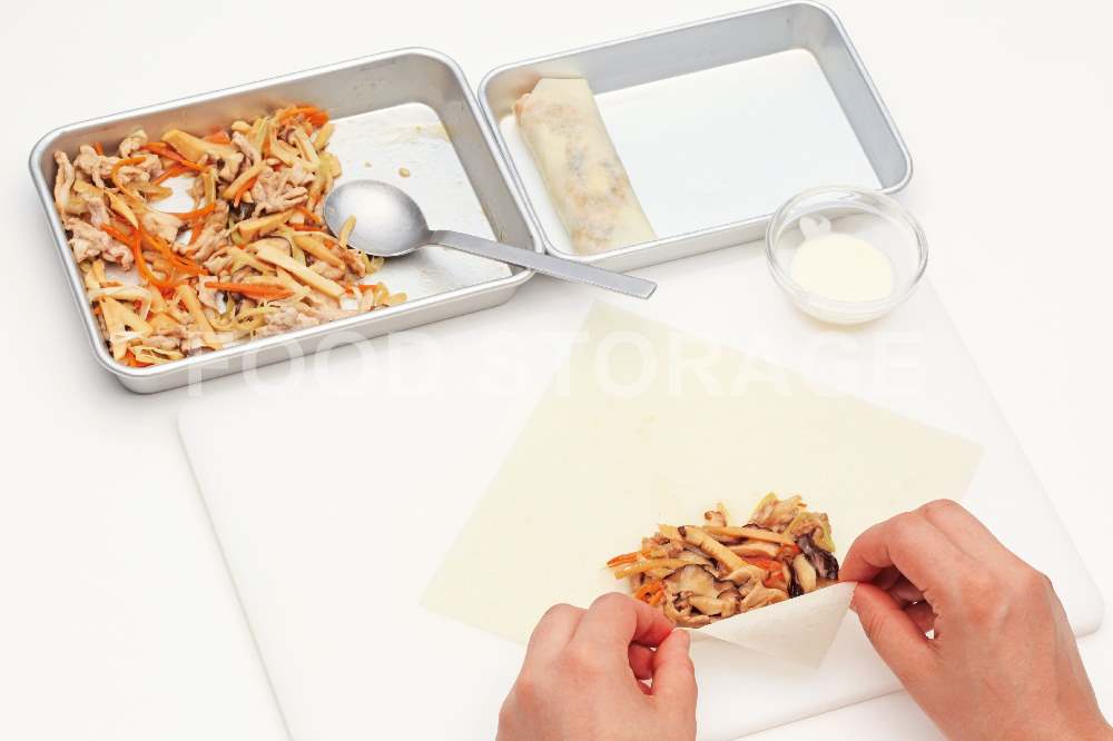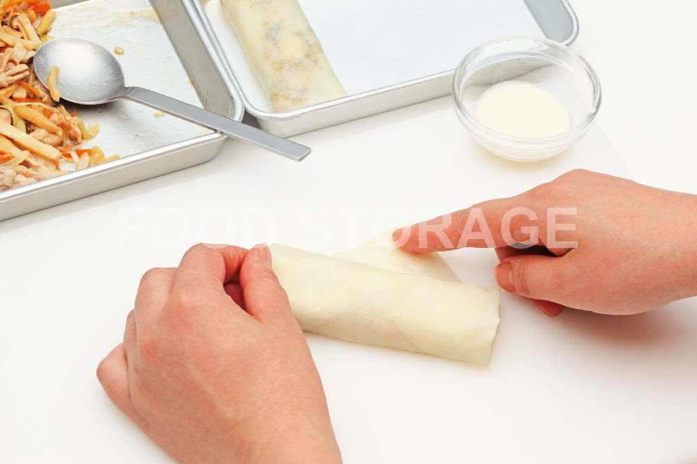 左右に織り込んで空気が入らないように巻き、巻き終わりを水で溶いた小麦粉で指でつけて留める。 |