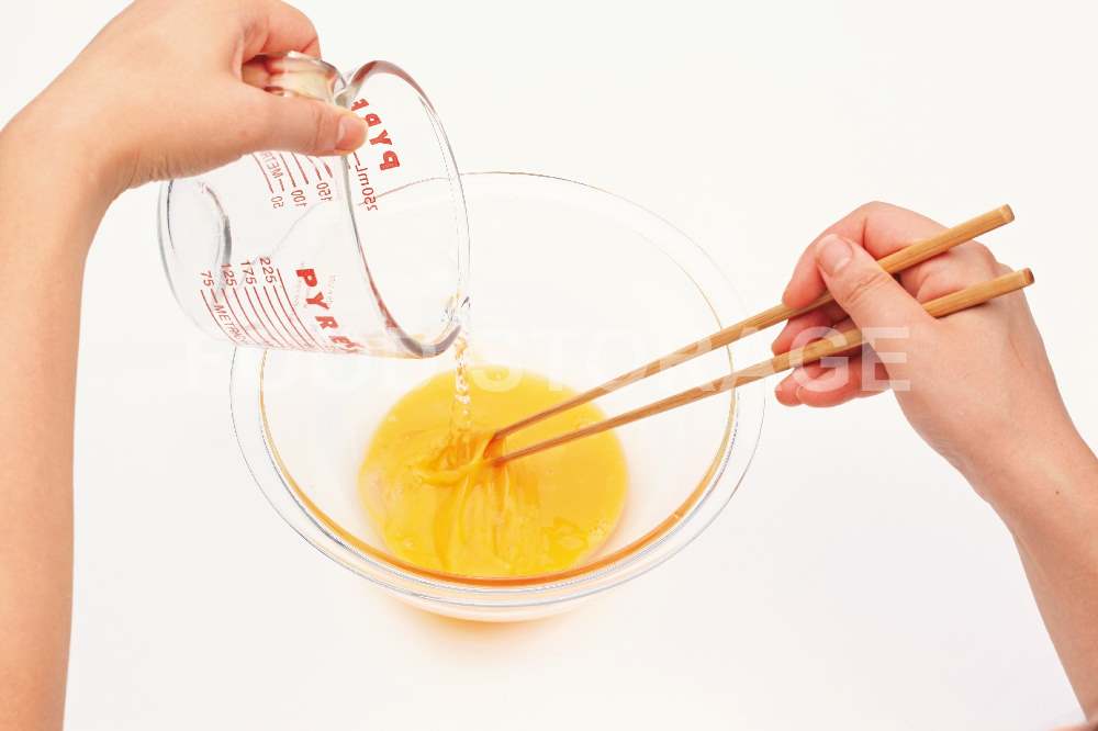 ボウルに卵を割りほぐし、冷水を注いで混ぜる。