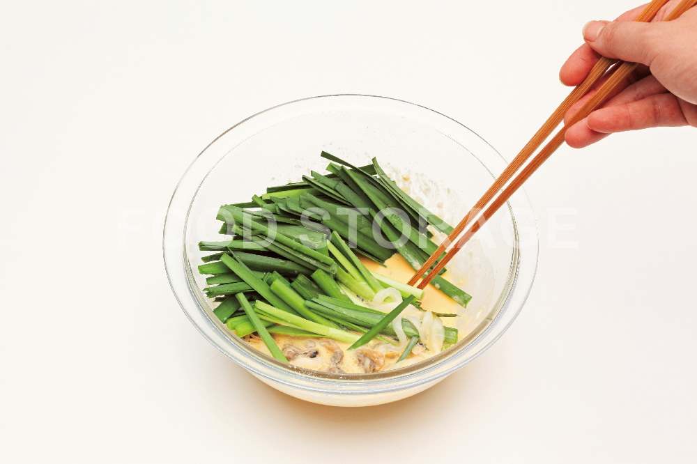 小麦粉、塩を加えて粉ぽさがなくなるまで混ぜる。あさり、にらを加え、いかはそのまま加えて混ぜる。