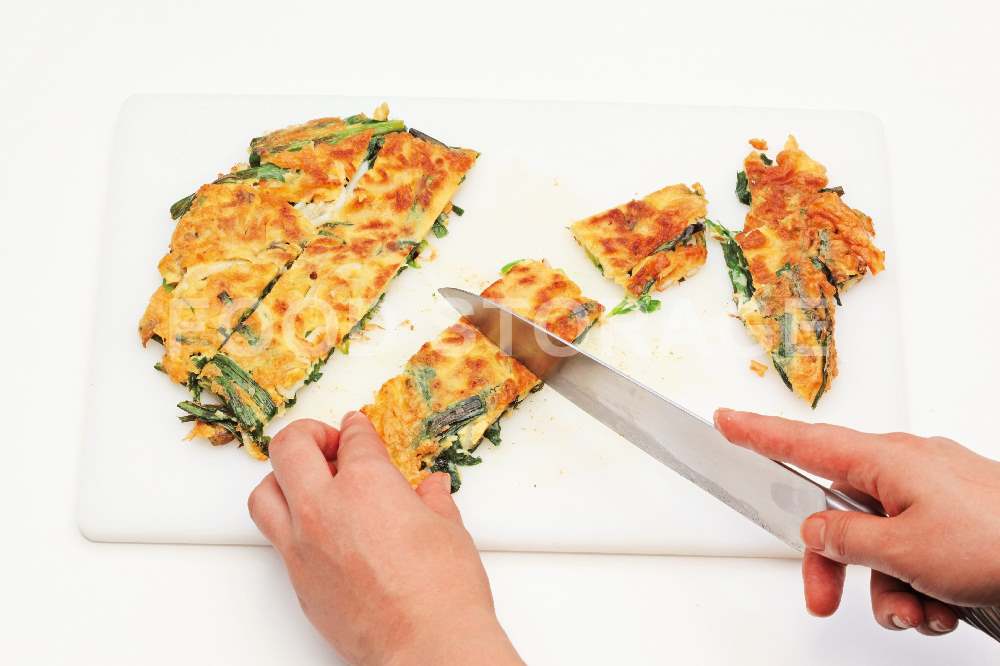 切り分けたチヂミをずらしながら、重ねて盛るとは取り分けやすい。 |