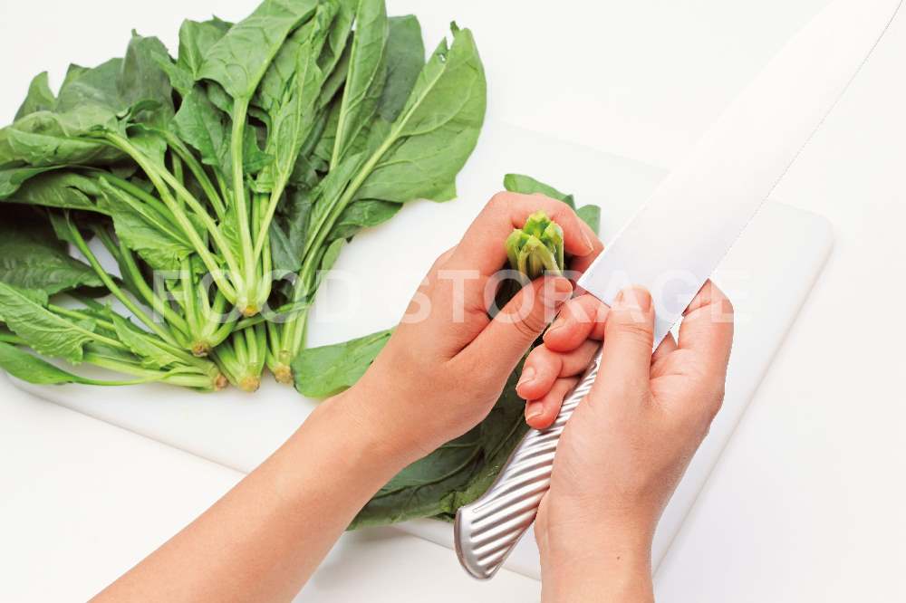 ほうれん草はよく洗い、根がついている場合は切り落として、根元の部分に十字に切り込みを入れる。 |