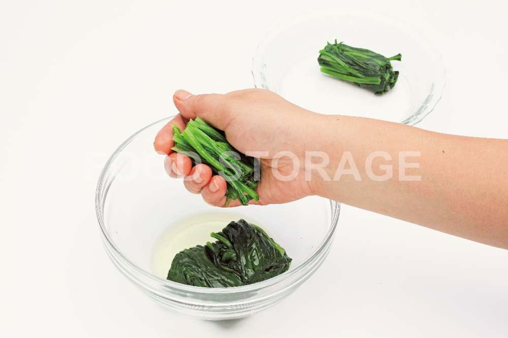 冷水にさらして水気を絞り5㎝くらいの長さに切って、さらによく絞る。2、3と同様に作り、器に盛り、白すりごま糸唐辛子をのせる。 |