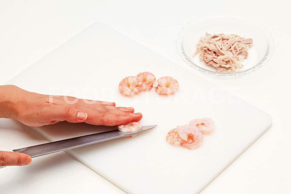 むきえびは背わたを取り、熱湯でさっと茹でて、水気を切り、厚みを半分に切る。ゆで汁を煮立てて豚バラ薄切り肉をさっと茹で水気を切って細切りにする。 |