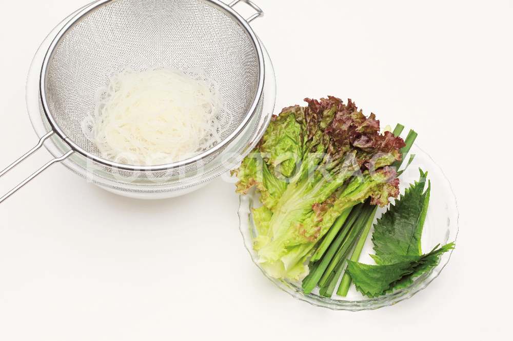鍋にたっぷりの湯を沸かしビーフンを3分茹で、ざるに揚げる。青じそは軸をとって縦半分に切る。にらは3等分の長さに切る。サニーレタスは縦半分にちぎる。 |