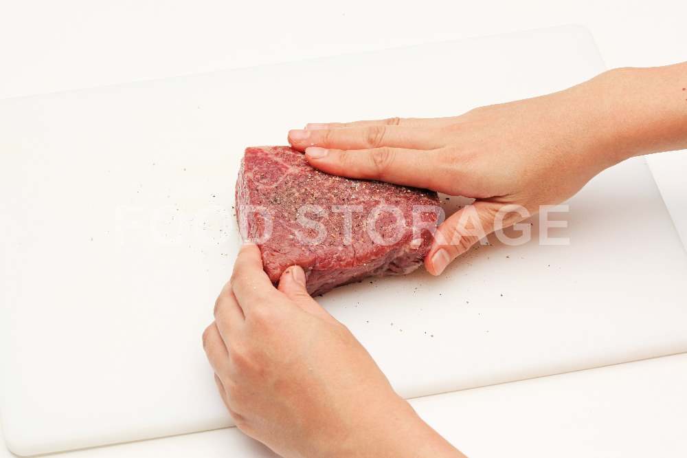 牛もも肉は塩と粗挽き黒こしょうをまぶし、肉の表面にすり込むようにして、全体に下味をつける。 |
