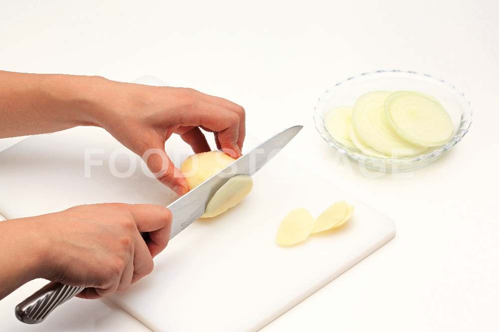 玉ねぎは5㎜幅の輪切りにし、じゃがいもは皮をむいて2~3㎜幅の薄切りにする。 |