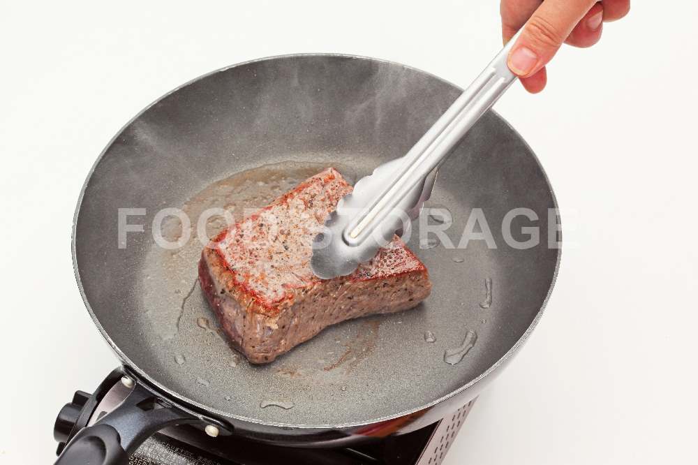 フライパンに牛脂を入れて強火で熱し肉を一面ごとに2~3分ほど、しっかりと焼き色がつくまで焼いて全体を焼く。 |
