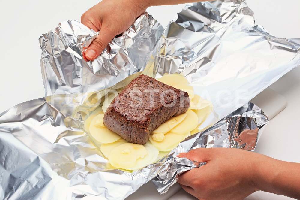 アルミホイルを開いて肉と玉ねぎ、じゃがいもを取り出し、肉汁は別の皿に取っておく。 |