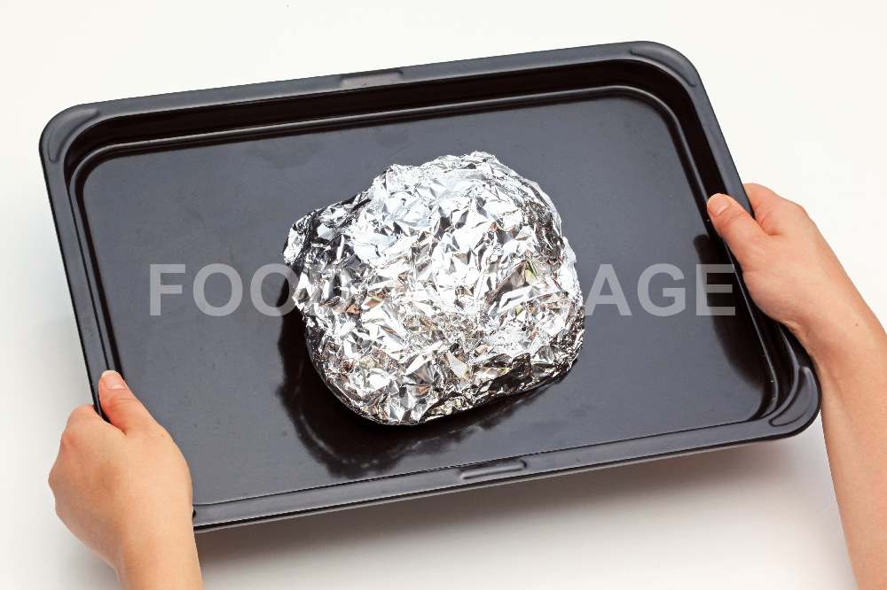 170℃に予熱したオーブンで焼き、アルミホイルに包んだまま20分放置する。