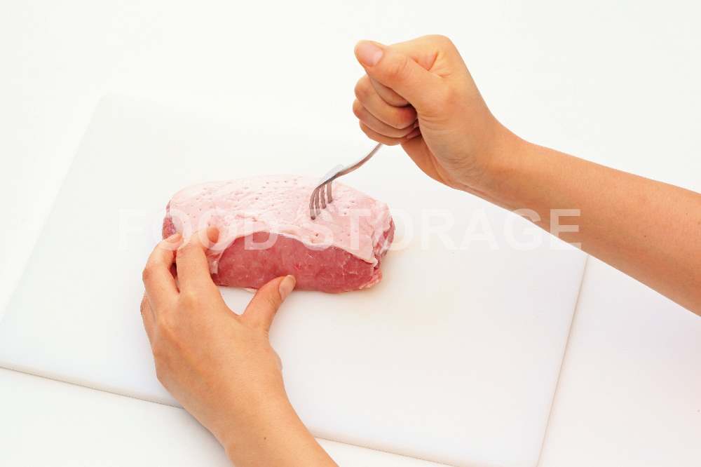 ポイント:火が良く通り、味が染み込むようにフォークを刺す。 |