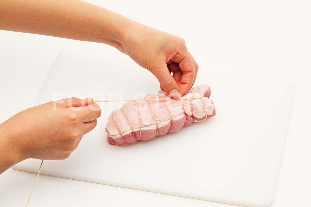 1の形を整えながら、タコ糸を巻き付け、塩、こしょうをふって5分ほどおく。 |
