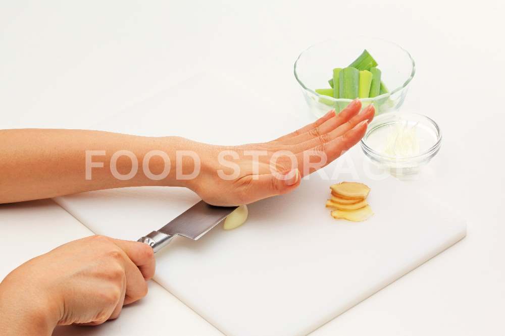 長ねぎの青い部分はブツ切りにし、白い部分は白髪ねぎにする。しょうがは薄切りにし、にんにくは包丁の腹で潰す。 |