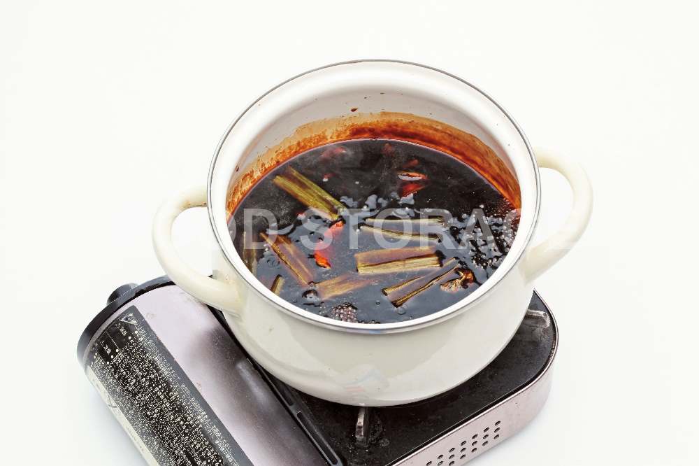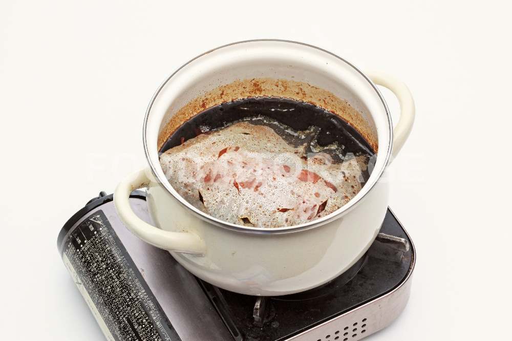 鍋にしょうゆ、みりん、酒、白髪ねぎ以外の3を入れて吹きこぼれないように注意しながら、ごく弱火で約40分煮詰める。 |