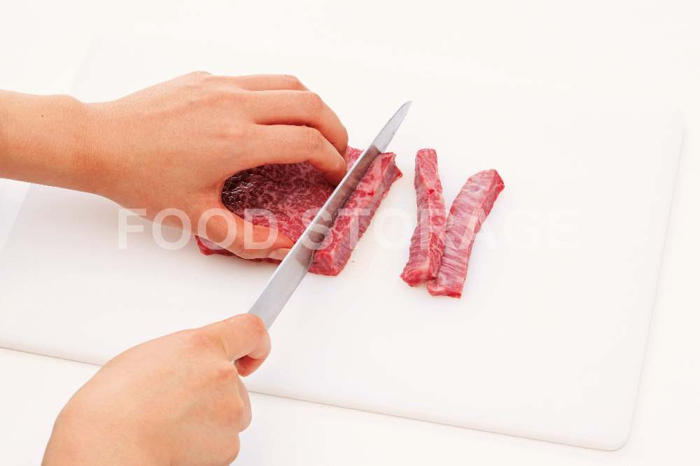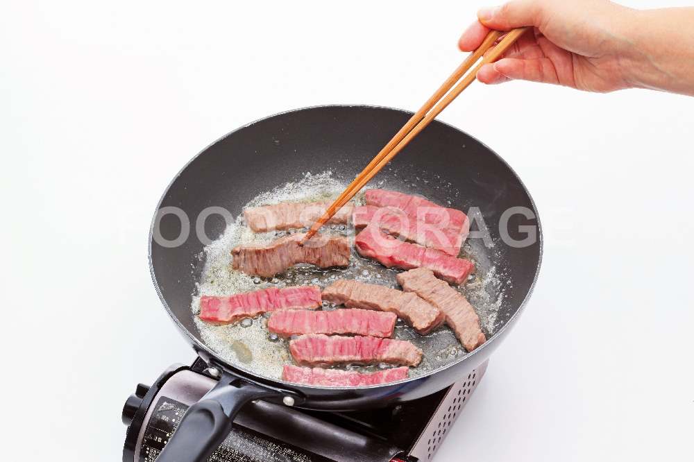 牛ランプ肉は1㎝厚さに、さらに1㎝くらいの棒状に切り塩、こしょうで下味をつける。 |