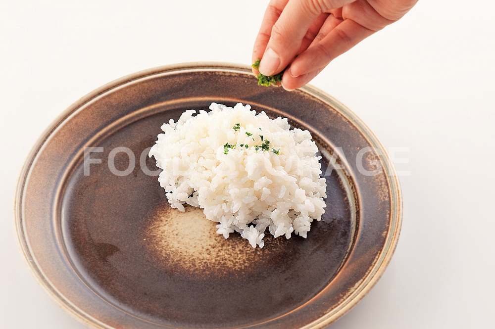 ご飯を持ってパセリを振りビーフストロガノフをかける。サワークリームは中心にのせてトロット溶けると美味しそうに見える。 |